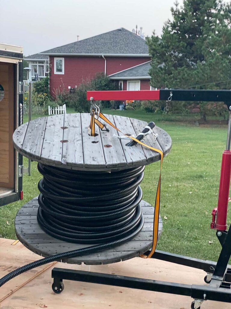 We got the spool of cable from Eecol in Edmonton, and the thing weighed probably close to 1000 pounds – enough that I was a bit concerned that it might be too heavy for our little trailer. But we did get it home. Getting it off the trailer was another adventure – I unspooled about half of it onto the ground loop by loop, and then I was able to get an engine hoist under it to lift the rest of the spool out.