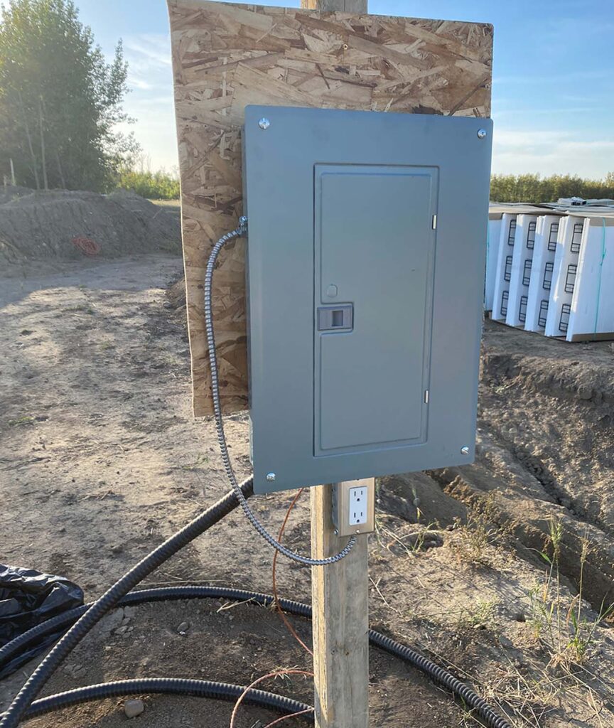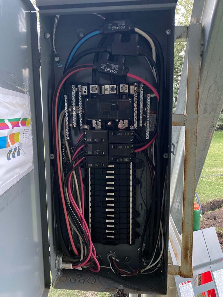 With the electrical cable laid out and connected at our solar panels, I was able to set up a temporary service at the observatory so we didn’t have to run the generator any more when we needed power there. The panel will eventually find its way inside the observatory when the building is framed.