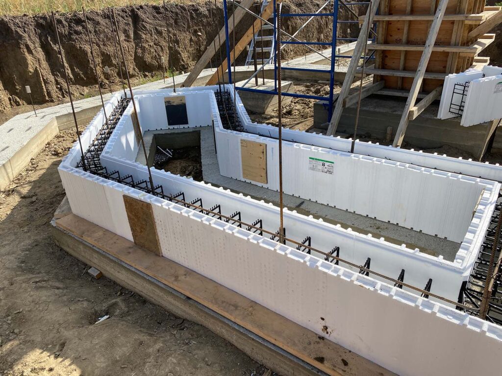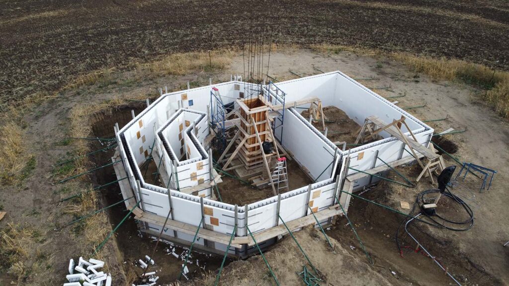 At this point, we have finished the inner ICF frost wall that will be below the staircase, and are partway through constructing the octagonal structure. Jeannie is working on tying the rebar in place as we go.