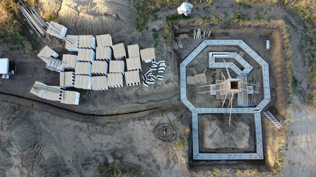 As the ICF walls grew taller, we needed a way to easily be able to get in and out of the enclosed space. So I had to build “bridges” that would span over the top of the walls. The one in the foreground will allow us to get into the rectangular area of the foundation from outside, and the one in the background using our blue scaffolding as one end of the bridge allowed us to transition from the rectangular area into the octagonal one.