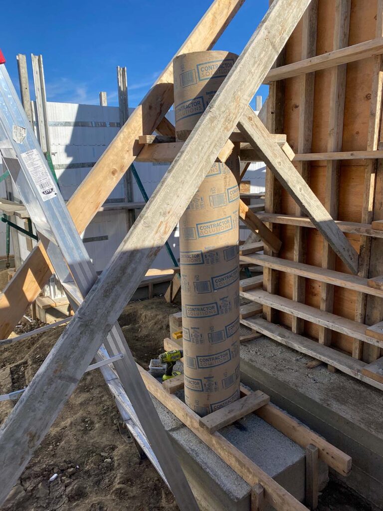 So that they wouldn’t be weakened in the rain, I waited until the day before we scheduled the cement pour to install the 12″ cardboard sonotubes. They will be used to make cement columns transferring the load from teleposts to the floor of the second story to the telepost pads that will be 8 feet below grade. The bracing for the telescope pier was a handy support structure that could also be used to keep the sonotubes plumb.